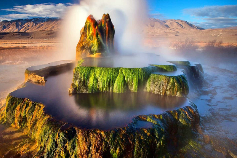 This vividly colored geothermal formation in Nevada emerged accidentally during a drilling operation in the 20th century. Mineral-rich water continues to build cone-like structures while thermophilic algae give it its distinctive red and green hues.