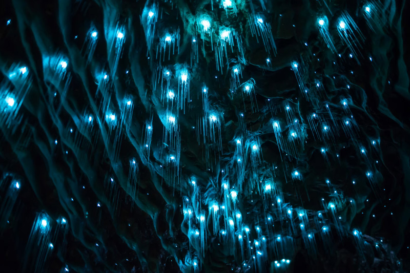 Thousands of bioluminescent larvae illuminate cave ceilings, creating a star-like effect in complete darkness. The glow is a biological adaptation used to attract prey, producing one of the most otherworldly natural light displays on the planet.